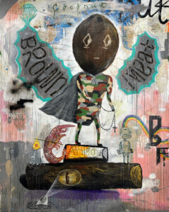 John Yoyogi Fortes is a Filipino-American artist questioning and exploring the physical and psychological landscapes of self. Drawing inspiration from pop culture, comics, nature, and Filipino culture and history, John’s multi-layered works combine various mediums often depicting obscure worlds wrapped in an amalgamation of artistic styles, techniques, dark humor, and word play. His work in the exhibition explores his relationship with nature, water, and the land rediscovered during the pandemic as an act of decolonizing himself –a reconnection to something ancestral.